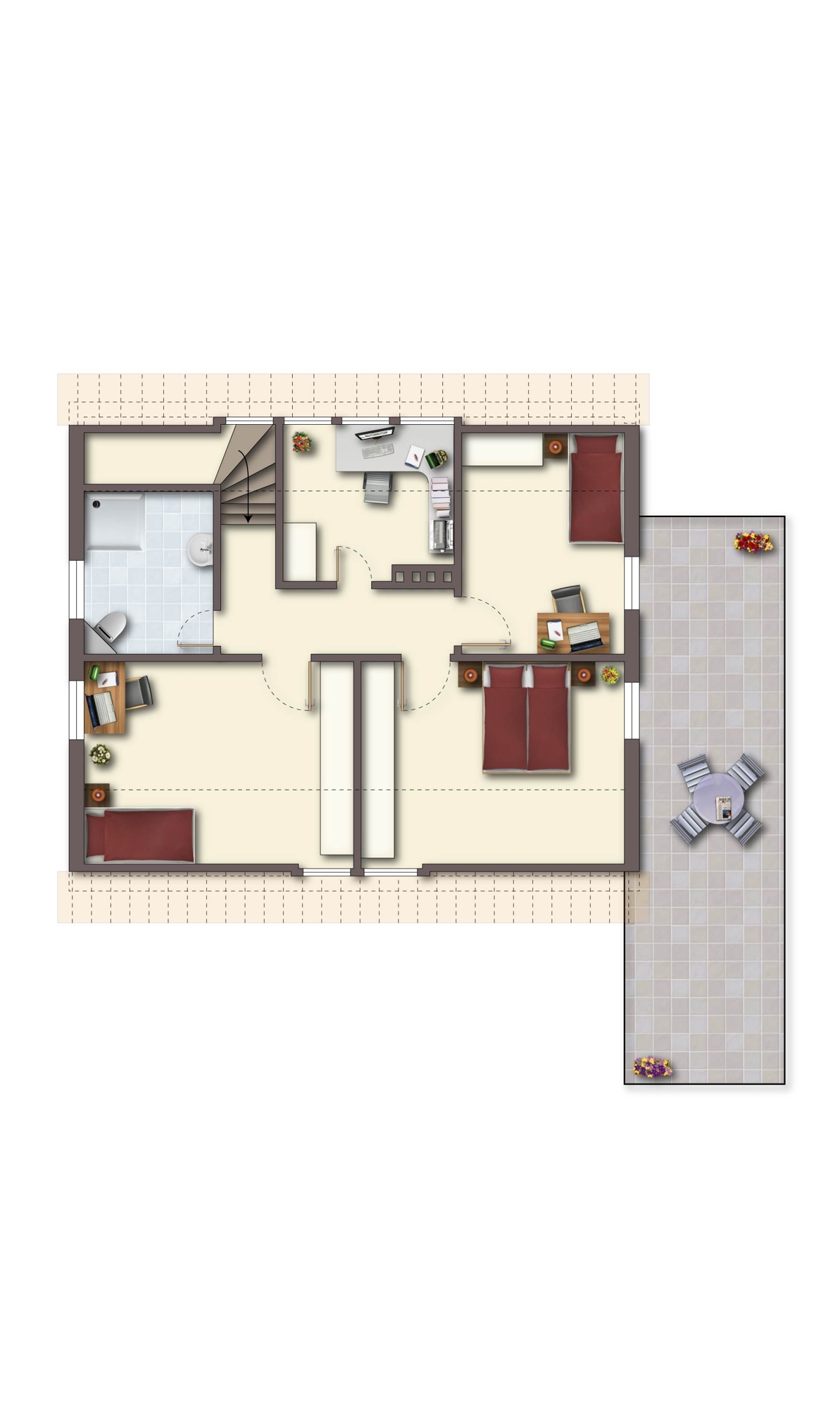 Im OG befinden sich aktuell drei weitere Räume, die sich ideal als Schlaf-, Kinder- und Arbeitszimmer nutzen lassen. Eines der Zimmer lässt sich ebenfalls wieder teilen, sodass auch hier ein weiterer Raum entstehen könnte. Damit lässt sich das Haus mit wenigen Handgriffen von 4,5 auf 6,5 Zimmer erweitern. Das vor wenigen Jahren sanierte Tageslichtbad im OG verfügt über eine begehbare Dusche. Über der Etage liegt ein Dachboden für weiteren Stauraum. Der Vollkeller inklusive Garage und Carport rundet das Angebot ab.
